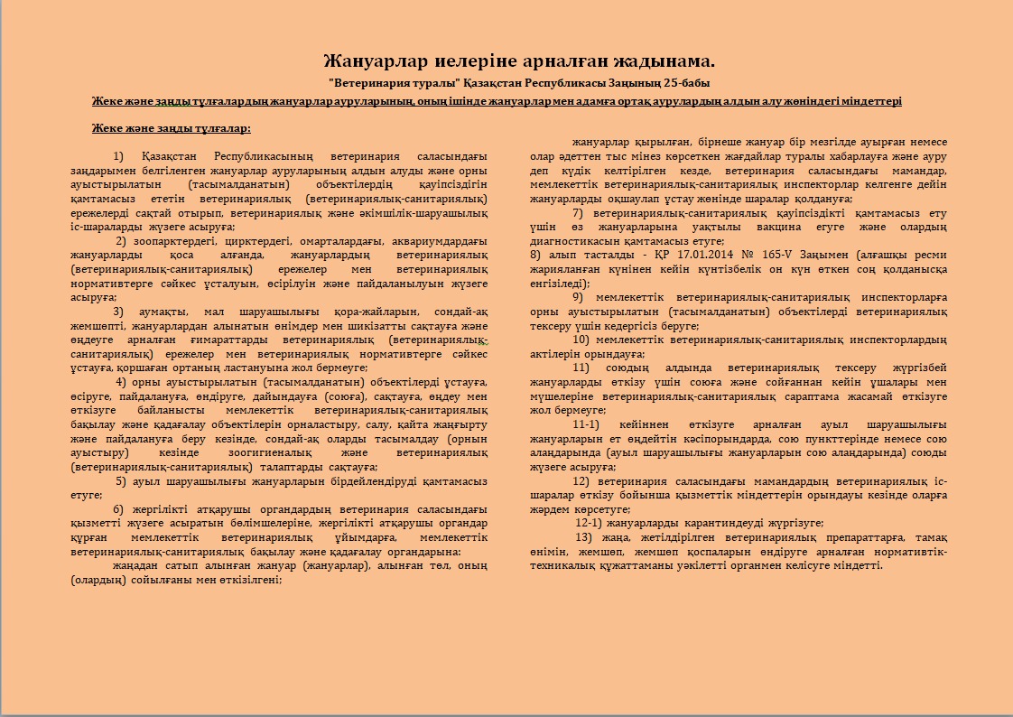 «Меншік иелеріне арналған жадынама «Ветеринария туралы» Қазақстан Республикасы Заңының 25-бабы